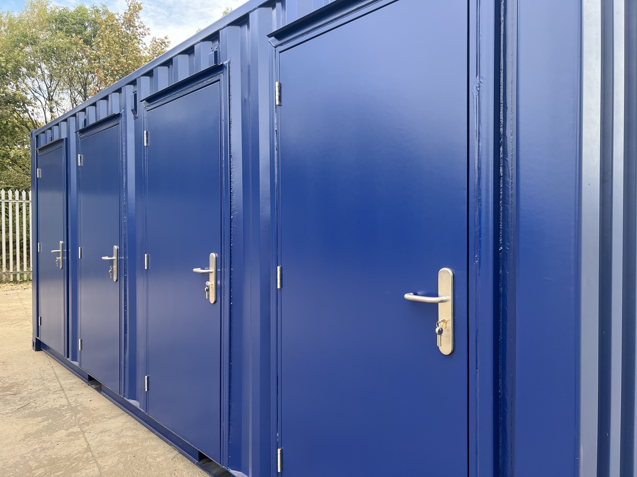 Transform a single 20ft shipping container into a multi-unit storage solution! This customized blue container features four individual roll-up doors and movable interior partitions, giving you the flexibility to create 2, 3, or 4 separate storage units based on demand.