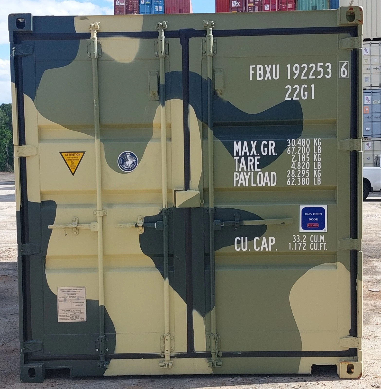 This New One Trip 20′ Camouflage Shipping Storage Container combines rugged durability with a unique, tactical look. With only one overseas trip, it’s in like-new condition—wind and watertight, rodent-proof, and fully lockable.